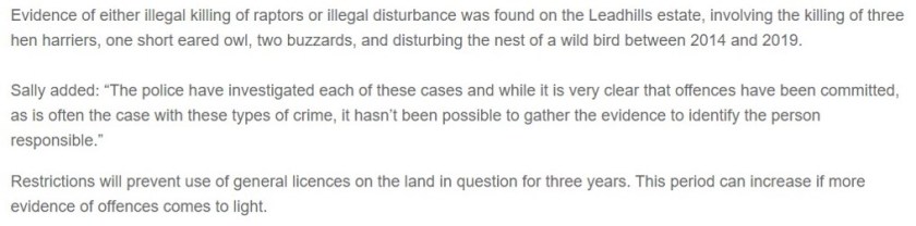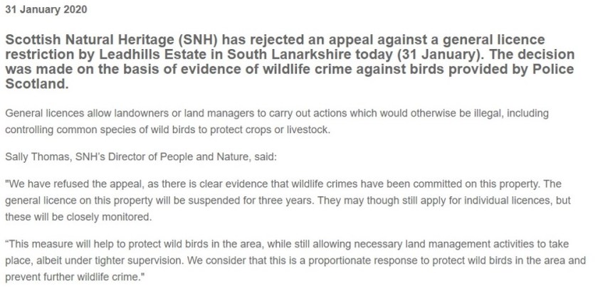 In late November 2019 Scottish Natural Heritage (SNH) imposed a three-year General Licence restriction on Leadhills Estate, South Lanarkshire, after receiving what it described as “clear evidence” of wildlife crimes from Police Scotland (see here, here and here).