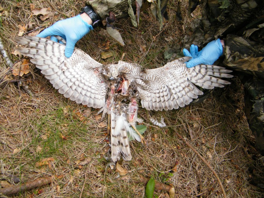 [Photo: an illegally killed sparrowhawk being retrieved by an RSPB Investigations Officer. Image by Guy Shorrock]