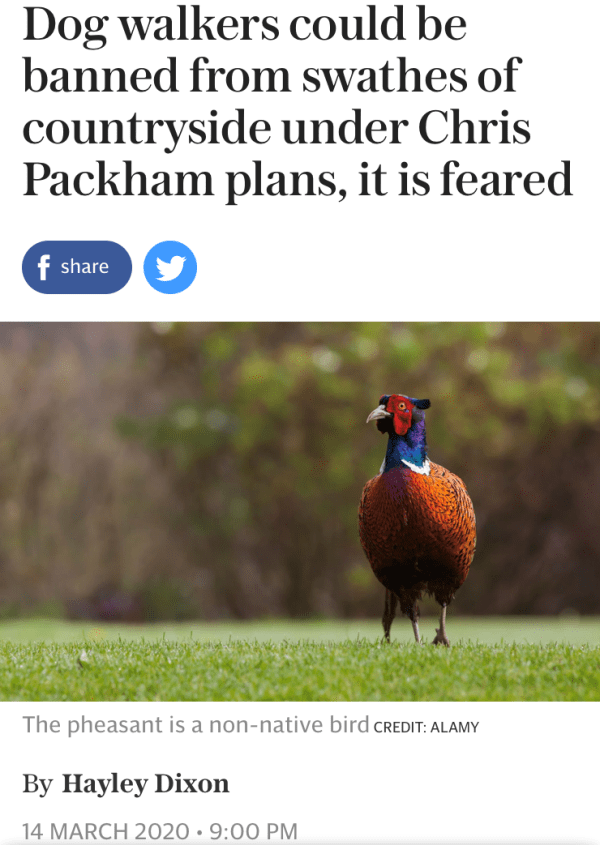So would it not be more honest if the headline read: “Dog walkers are already banned from swathes of countryside so that a few privileged individuals can kill our wild birds”?