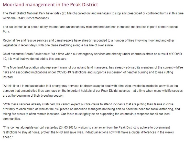 The Chief Executive of the Peak District National Park Authority has now published a statement calling for gamekeepers / grouse moor managers to stop the burning on the grouse moors of the National Park: