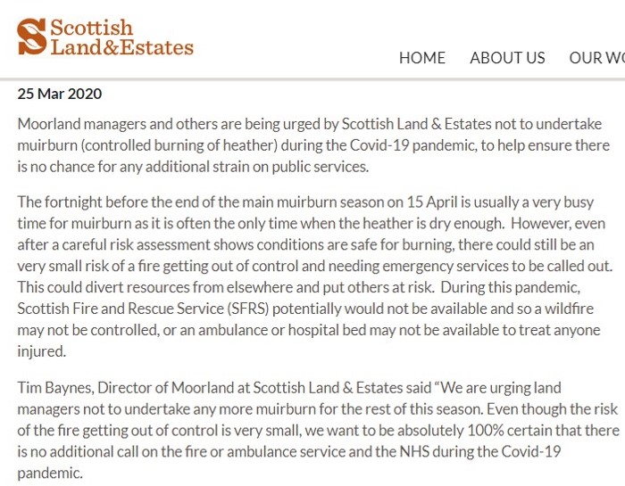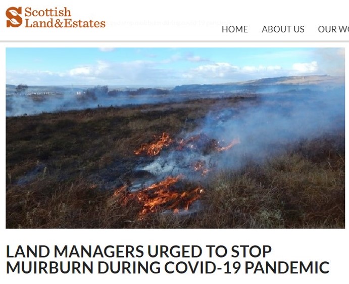 North of the border the landowners’ lobby group Scottish Land & Estates is also ‘urging’ its members to stop being so bloody stupid and has published a statement calling for an end to the burning: