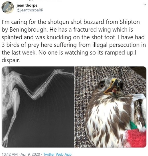 The buzzard that was found shot near Shipton in North Yorkshire on 29 March 2020 (see yesterday’s blog, here) is now in the care of wildlife rehabber extraordinaire Jean Thorpe.