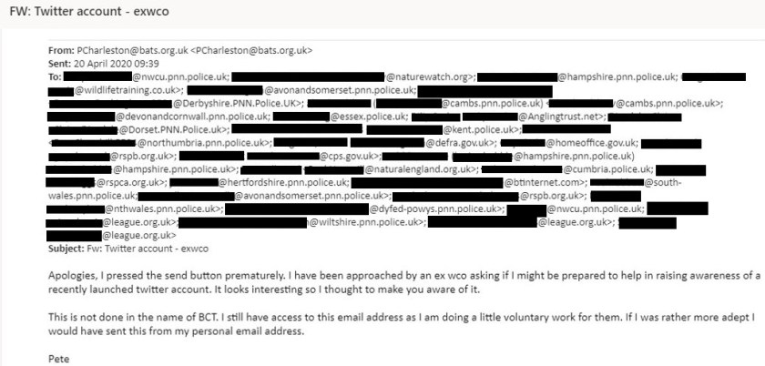Yesterday, ‘EXWCO’ decided to reveal his identity to the public at large – it’s a guy called Pete Charleston, a former police wildlife crime officer and someone who has held other related roles since retiring from the police. He’s perhaps best known for his work with the Bat Conservation Trust and his role as Chair of the LINK Wildlife Crime Group, which is how I know him as I represent Wild Justice in that partnership and is why I’m so surprised that he’s chosen to behave as he has in response to Wild Justice’s new fund. I’m pleased to see that he has now resigned from his leadership position at LINK because, in my opinion, it’s clearly untenable in light of his online behaviour in recent days.