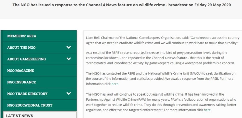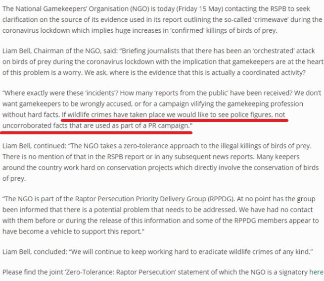 The response from the National Gamekeepers Organisation (NGO) was its usual attempt to undermine the credibility of the RSPB, bleat about being a signatory to an as yet undemonstrated stance of ‘zero tolerance‘ of raptor persecution, and to demand information from the police on recent raptor crimes (see here). Here is a copy of the NGO’s response, copied from it website (red bit highlighted by RPUK):