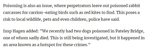Sadly the sad excuses for human beings who leave these poisons in the countryside are a potential curse in all areas but once again, North Yorkshire seems very much in the news. I am delighted that Wild Justice has set up a fund to raise money to help wildlife crime officers in constabularies all over the U.K. to better detect and prosecute the cowardly criminals who perpetrate these crimes -often of course perpetrated by game keepers and others employed in the shooting”industry”. Obviously we all know that their employers should also be prosecuted through vicarious liability which if it ever becomes legal(I know that this law already exists in Scotland) in the rest of the UK would help to hopefully deter at least some of these criminals. They obviously have no regard to the safety of humans and their domestic pets and so these psycho’s really are a danger to society-yes as stated in a previous response to this outrageous crime-I think that as a society we are pathetic-our laws here are weak and our law enforcement agencies are underfunded-BECAUSE our Government panders to the people who own these shooting estates and other low life-this is why at a conservation legislation level, our laws are pathetic and frankly backward!