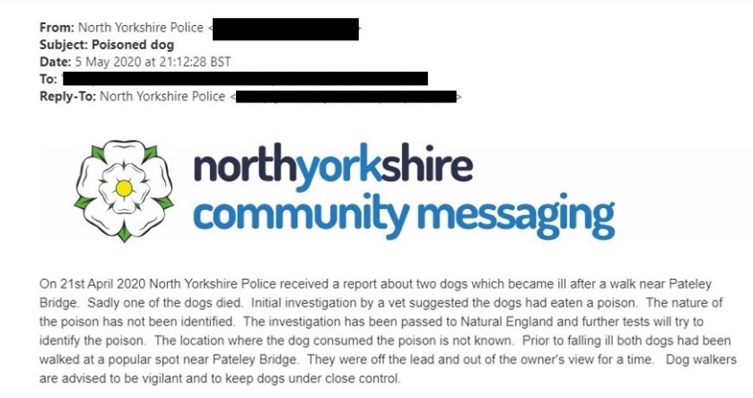 North Yorkshire Police are warning the public of potential poisonous baits at Pateley Bridge in Nidderdale following the suspected poisoning of two dogs in April. [August 2020: See update at foot of blog]