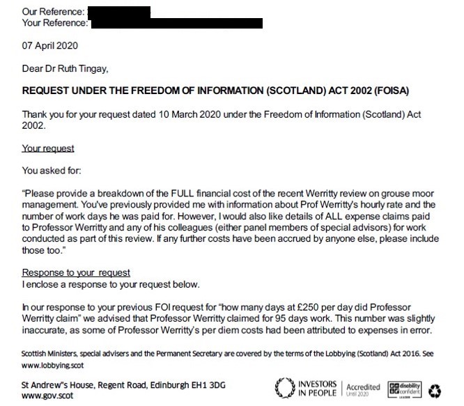 Meanwhile, we’ve been interested in finding out how much the Werritty Review cost the taxpayer. This hasn’t been a straightforward process as ludicrous obstacles were put in our way (e.g. see here) but we do now have an answer, of sorts.