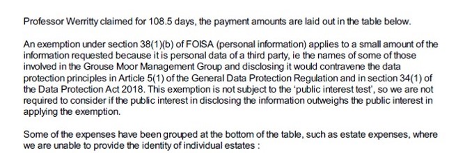 Interestingly, a number of names involved in the Werritty Review have been redacted from this table of costs. Looking through the full list of panel members and special advisors, as announced by the Scottish Government back in November 2017 (see here), through a process of elimination we believe the missing names from this costings table to be: