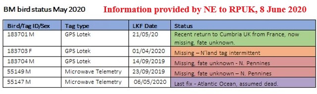 On 28 May we asked Natural England for information about the status of these five birds (amongst other things). Natural England Director Rob Cooke has provided the following information to us this afternoon: