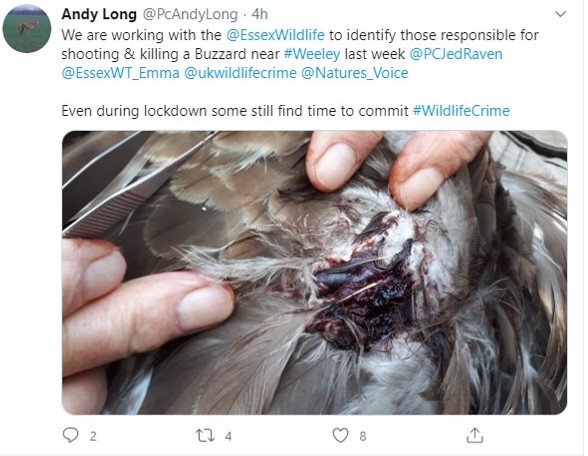 A buzzard was shot and killed last week near Weeley, in Essex, according to PC Andy Long on twitter.