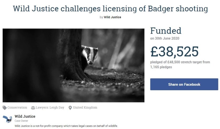Just three days ago Wild Justice launched a crowdfunder to raise £48.5K to support a legal challenge against the badger cull (see here).