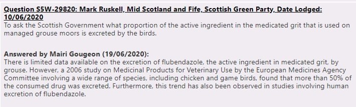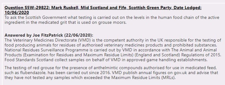 So in four years of testing, the VMD has managed to test a grand total of 23 red grouse for residues of the drug Flubendazole. When you consider that an estimated 750,000 red grouse are shot in the UK each year, it’s no wonder the VMD can say with confidence that it hasn’t detected any drug residues above the maximum permitted limit, because it’s hardly tested any samples at all! Joe Fitzpatrick should have checked these source data to put his answer into context because as it currently stands it looks like he’s professing there’s no issue with the drug reaching the human food chain, instead of admitting that there’s inadequate testing going on to reach any such conclusion.