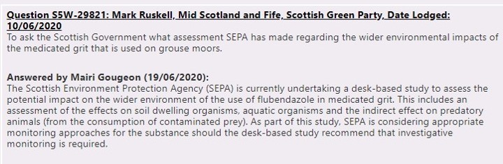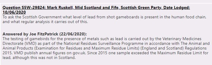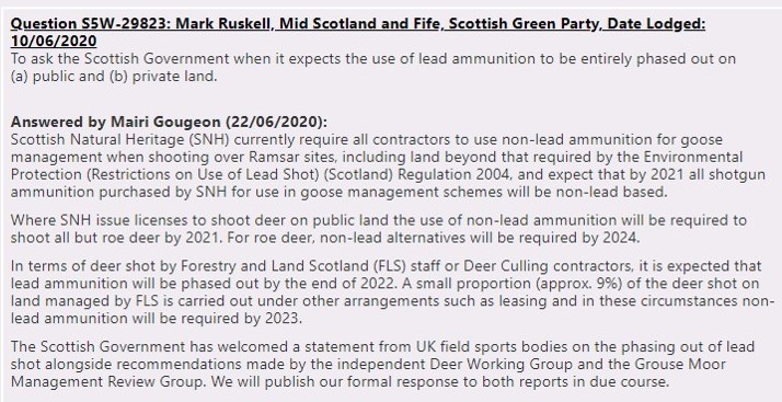 Last month Scottish Greens MSP Mark Ruskell lodged a series of Parliamentary questions about the toxic hazard of lead ammunition and the use of medicated grit on grouse moors (see here).