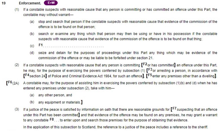 In the police’s tweet, they mention searches ‘under S19 of the Wildlife & Countryside Act 1981’. This refers to Section 19 of the Act, entitled ‘Enforcement’ and allows officers to enter private land, without a warrant, to conduct searches where there is reasonable suspicion that an individual is committing or has committed an offence: