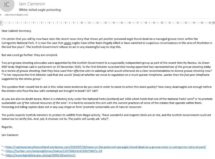 Public anger is palpable. Social media is still FULL of the death of this eagle, 48hrs after the news first broke, and hundreds of ordinary members of the public have been so incensed they’ve taken to writing emails to the very top of the pile, First Minister Nicola Sturgeon.