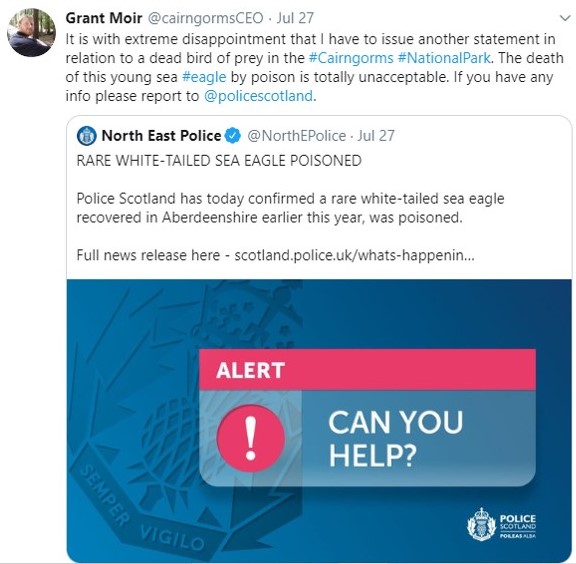 I have read your comment re: the poisoning of the Sea Eagle on the land where you are CEO. I would be most interested in reading your job description just to check what your responsibilities are in that role.For example, are you responsible for maintaining the safety of all those who come to the Cairngorms? If so you must be very worried that somebody’s dog may be poisoned. Are you aware that Carbofuran is a banned poison that is being used in the national park where you are CEO. This makes your less than notable Tweet the more concerning.