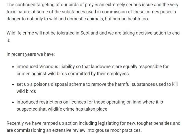 So in the statement there is no mention of taking steps to increase prosecutions, no mention of giving the police or investigative bodies additional powers to deal with raptor persecution incidents, no mention of taking away public funding through grants etc to those estates where raptor persecution has taken place, and no mention of actually making national parks a safe haven for fauna or flora.