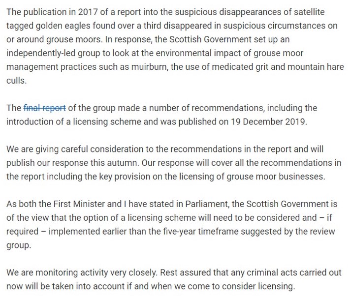 16. I think the main point here is the Environment Secretary has been forced to produce a statement because of all the correspondence the Scottish Government has received, true it does not go far enough. However it is safe to say the grouse moor owners and managers will be less happy, as they would prefer Scotland’s dirty little secret out of public view.