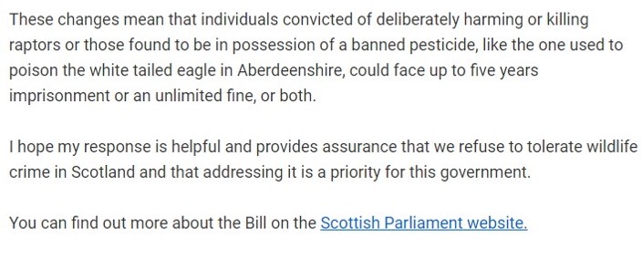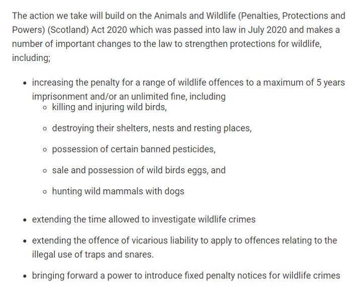 1. Some really interesting points. Could someone with legal knowledge construct an email incorporating these points which could be targeted at MSPs and the Scottish Government following on from the previous one? That way the First Minister and Environment Secretary don’t have a chance to “forget” Wildlife crime.