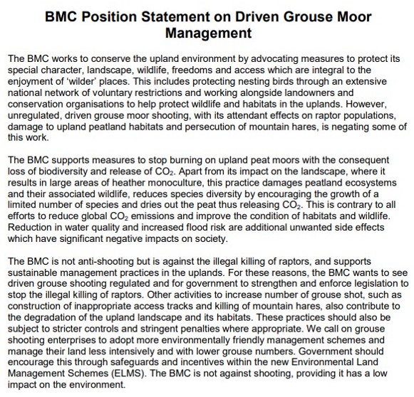 This is really encouraging. Even though the BMC is advocating the ‘regulation’ of driven grouse shooting, which presumably means licensing rather than a ban, and there are well rehearsed arguments for and against this approach, that’s not the point here.