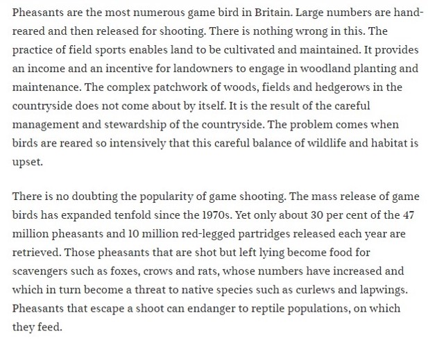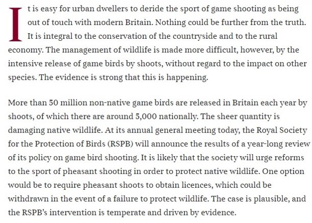 Imagine you are a member of the gamebird shooting industry in the UK, you’d just heard about the RSPB’s plans calling for gamebird shooting reform, and then you’d read the following damning editorial, in The Times no less, you’d surely realise the writing’s on the wall: