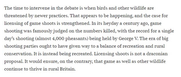 ‘There is no good reason for the oppositional stance that has become a reflex of many countryside organisations. It is the enormous dangers facing the natural world that should concern them, not a confected threat to their way of life. Self-regulation has failed to stop birds of prey including hen harriers from being poisoned by gamekeepers. Nor has it led to advances in land management, despite greatly increased public awareness of the risks of flooding, and the burning of peatlands (carried out in order that grouse can feed on new growth). Even the editor of Shooting Times was moved, in 2018, to decry the “greed that has crept into shooting”.