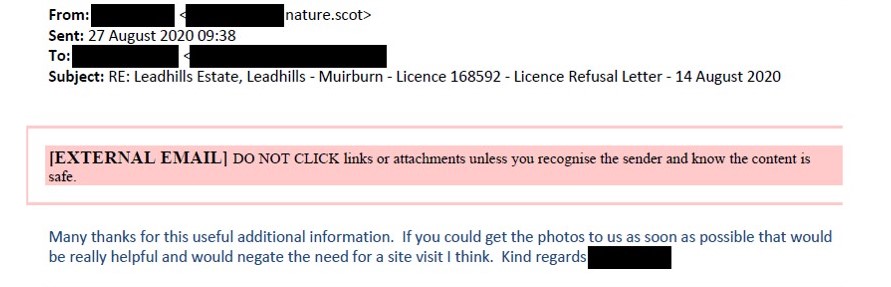 The following day, 27th August 2020, SNH wrote back to Osborne saying that if the requested photos could be supplied then a site visit from SNH at Leadhills wouldn’t be necessary: