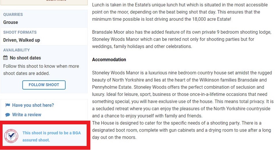 However, all is not lost if you know where to look. Here’s an example of the BGA logo being advertised on the Guns on Pegs website. This screengrab is the entry for the Bransdale Estate in North Yorkshire, where a police investigation is on-going after the discovery earlier this year of five dead buzzards shoved under a rock, four of them confirmed shot (here) –