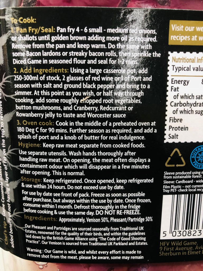 Thank you for your enquiry, the product you have enquired about is a branded product (not Sainsburys own brand) and we would encourage any further questions to be directed to Holme Farmed Venison, through their customer helpline.