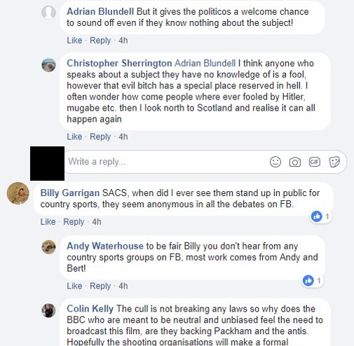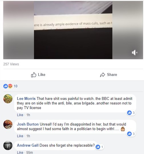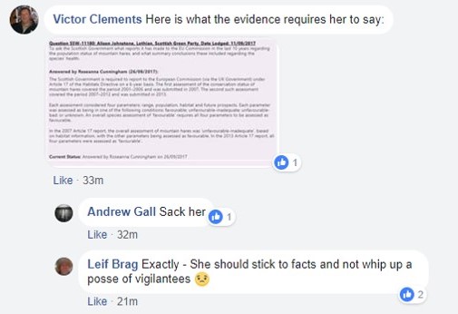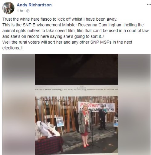 Here’s a short example targeting Environment Cabinet Secretary Roseanna Cunningham in March 2018 after she spoke to campaigners outside Holyrood about the mass slaughter of mountain hares on grouse moors (thanks to the blog reader who’s been compiling this material):