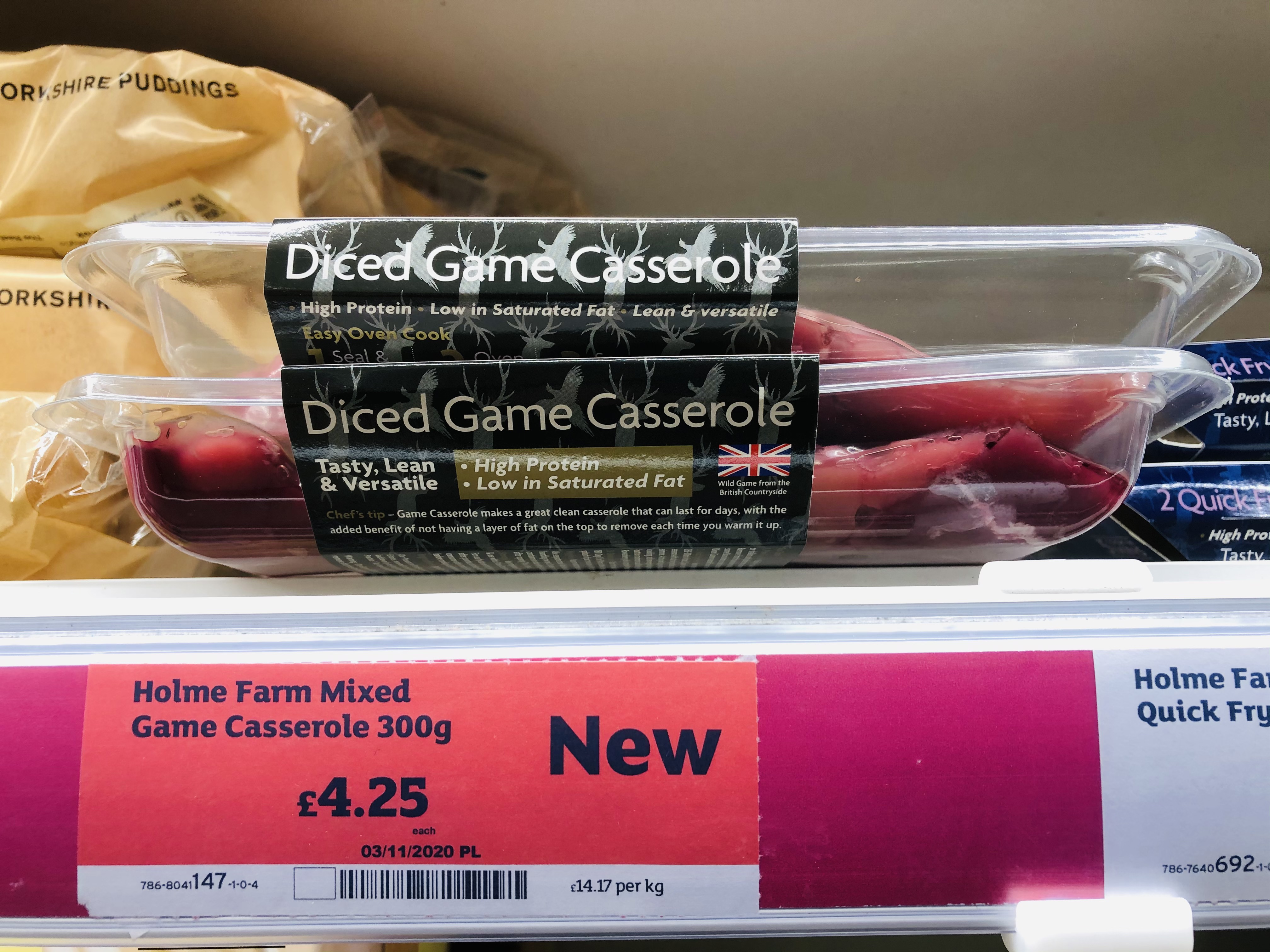 The product of interest is this diced game casserole, produced by Home Farmed Venison in North Yorkshire and kitemarked by the British Game Alliance, which claims to be the official marketing board for the game shooting industry.