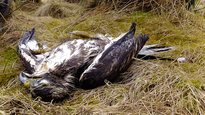 [An illegally poisoned buzzard, found on a notorious grouse moor in the Scottish Borders. Nobody was prosecuted for this crime, or any others that have been uncovered on this estate over a period of many years. Photo by RSPB Scotland]
