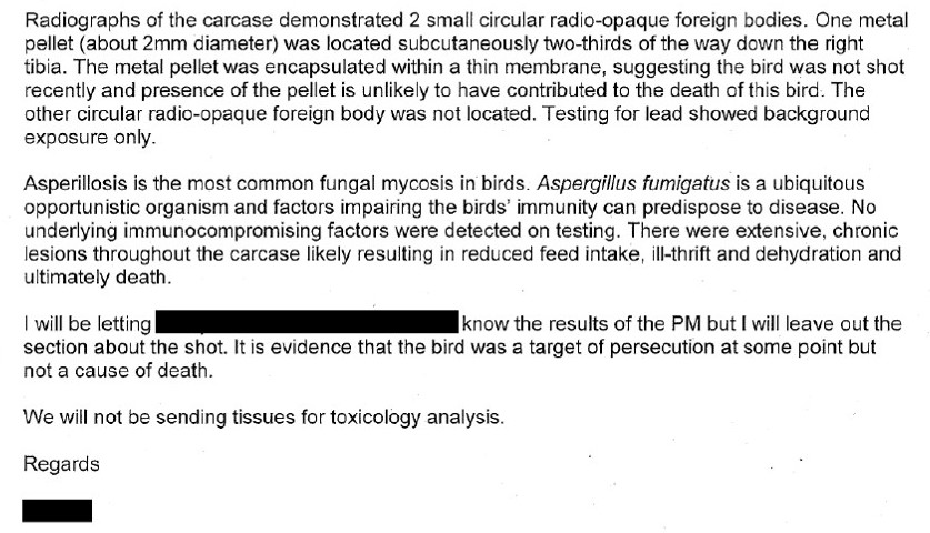 *Update 12.24hrs: The person who took the dead eagle from the walker and delivered it for post mortem has been in touch to say the Welsh Government did provide details of the pellet and did not try to dissuade her from sharing that information with the media. This information is supported by some of the FoI material I’ve received, which shows that the Welsh Government informed her about the pellet sometime after they’d first mentioned to her that Aspergillosis was the cause of death, and seemingly only after being prompted by an outside agency to do so.