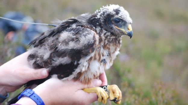 [A young hen harrier fitted with a satellite tag on Mar Lodge Estate in 2016. Photo by Shaila Rao]