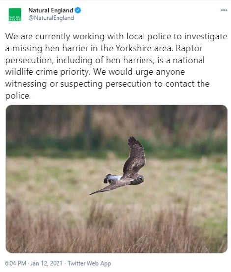 And who’s to say that Natural England’s tweet might just relate to yet another “missing” Hen Harrier. Nothing would surprise me.