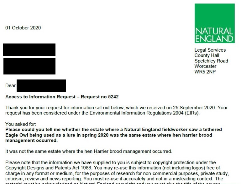 Thanks to one of our blog readers making a Freedom of Information request to Natural England, it can now be confirmed that yes, this [unnamed] grouse-shooting estate where a gunman was filmed crouching close to a tethered eagle owl, in the territory of a pair of breeding hen harriers, was also one of the estates where Natural England licensed the removal of hen harrier chicks for brood meddling last year.