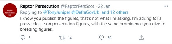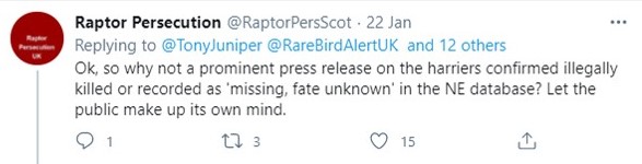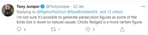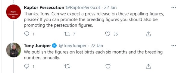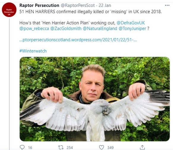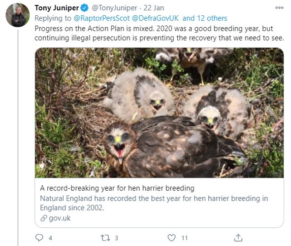 The exchange started with an RPUK tweet about the ever-increasing list of illegally killed/’missing’ hen harriers, now numbering 51 since 2018. Tony Juniper had been tagged in the tweet, along with others, with a sarcastic question about how the ludicrous Hen Harrier Action Plan was working out.