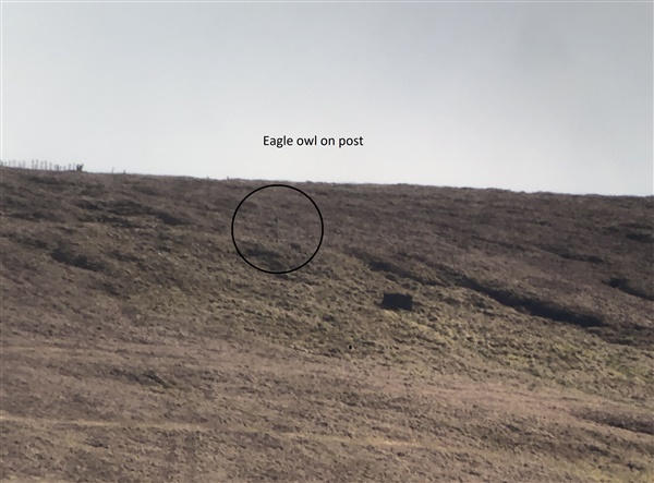 The blog, authored by RSPB Investigations Officer Howard Jones, describes the circumstances of the crimes, which include the obvious ones of shooting two protected buzzards but also the use of a tethered decoy (in this case, the eagle owl). Howard and his colleague Jack were filming through a telescope from approx 5km away and witnessed a gamekeeper drive across the grouse moor with the eagle owl, tether the owl to a post close to a grouse butt while he lay in wait close by with his gun.