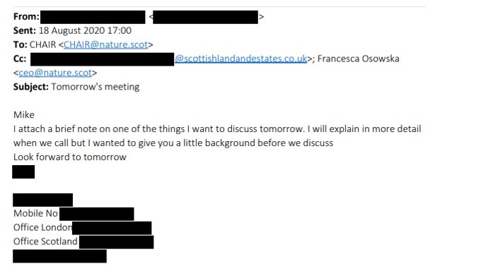 Here is a copy of an email sent to Mike Cantlay, Chair of NatureScot, on 18th August 2020. It was sent either by Tim Baynes (Moorland Director, SLE) or Mark Tennant (Chair, SLE). I know this because of the way my FoI was worded and even though NatureScot has redacted the sender’s name, my money would be on Mark Tennant.