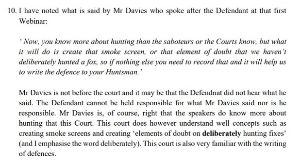 Well, here we are a year and a bit later. Mr Davies was NOT prosecuted for his role in the webinar, only Mark Hankinson was charged and prosecuted. However, if you read the judgement document it seems quite clear to me that Deputy Chief Magistrate Tan Ikram had cause to question the intention behind the comments made by other webinar participants, including Mr Davies, and that the judge wasn’t overly impressed with Davies’ comments about ‘creating smokescreens’ and ‘creating elements of doubt’, in the judge’s view presumably made to help hunt masters avoid prosecutions for illegal fox hunting. Here is the relevant excerpt from the judgement: