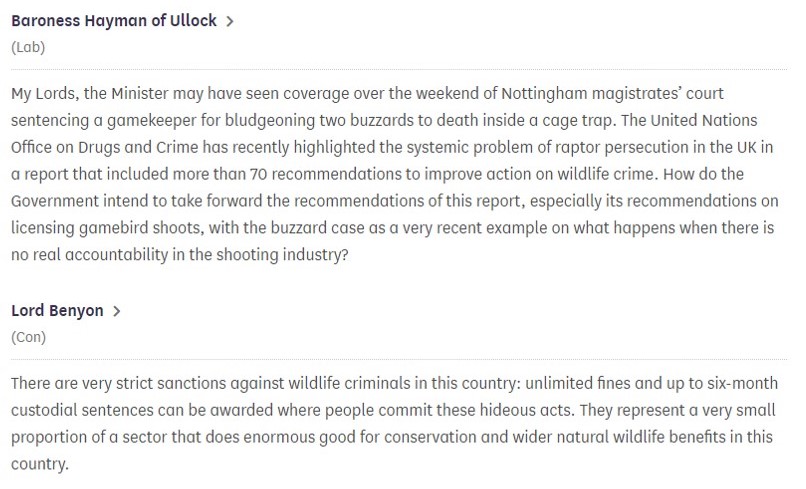 Today in the House of Lords the following exchange took place between Baroness Hayman of Ullock (Sue Hayman, a life peer serving as Shadow Spokesperson for Environment Food & Rural Affairs) and the Rt Hon Lord Richard Benyon (Parliamentary Under Secretary of State at DEFRA and a pheasant shoot and grouse moor owner):