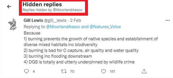 And they do like hiding things. Author Gill Lewis responded to the tweet with a perfectly reasonable and polite reply, explaining (as if they didn’t know) why setting fire to grouse moors is an issue. In response, the Moorland Association used the new Twitter feature to ‘hide’ Gill’s message, making it more difficult for people to read it: