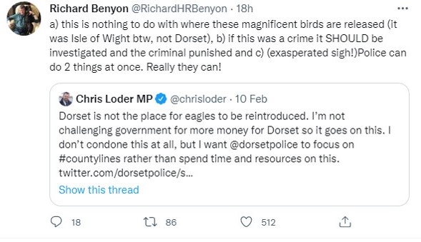 Yesterday, Dorset MP Chris Loder’s Twitter notifications must have been off the scale as hundreds of angry people took him to task for his shocking comments (here) about not wanting Dorset Police to investigate the suspicious death of a white-tailed eagle, found dead on a Dorset shooting estate in January (here).