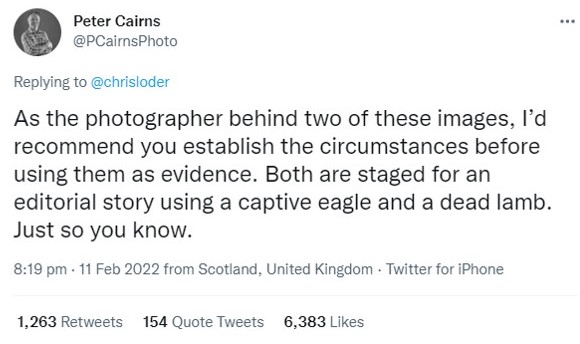 This ridiculous statement (“plaguing our farmers“, FFS!) attracted plenty of well-deserved ridicule but it also generated even more anger and in some cases, unfortunately, personal abuse towards Mr Loder. But even when photographer Pete Cairns pointed out that the two photos of the eagle with a lamb had been staged, by Pete, for a separate project and then mis-used to illustrate the Scotsman article to which Mr Loder was referring, (this was a captive eagle with an already-dead lamb placed in front of it), Mr Loder was not for backing down.