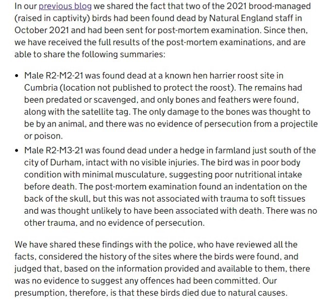 Natural England has finally published the post-mortem results of two brood meddled hen harriers found dead in October 2021.