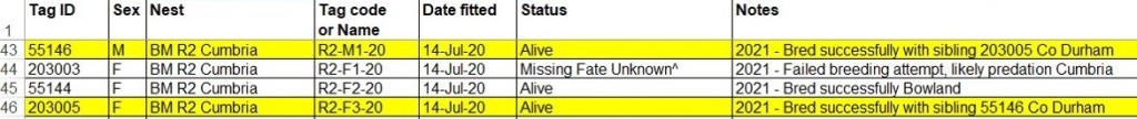 Two sibling hen harriers, both hatched in the same nest in 2020 (nest site: BM R2 Cumbria) and both brood meddled as part of NE and DEFRA’s sham conservation project, apparently ‘bred successfully‘ in Co Durham in 2021 (see lines 43 & 46 in the March 2022 spreadsheet).