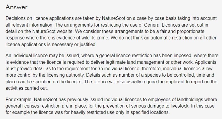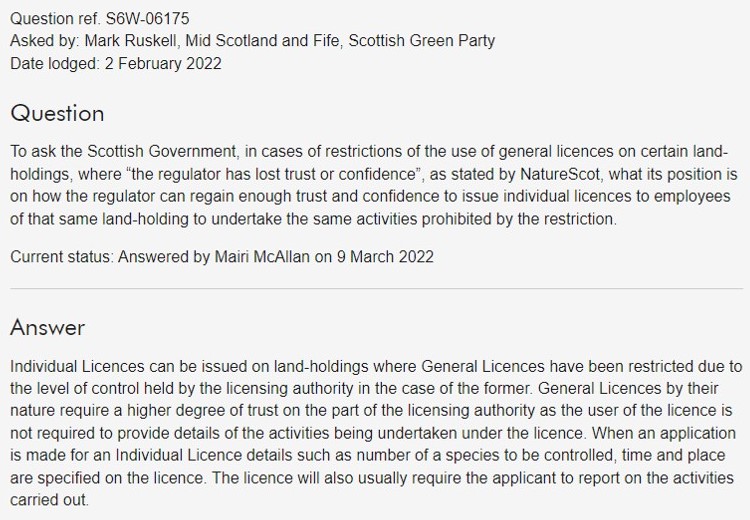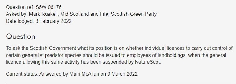 Whatever happened to the Scottish Government’s 2019 commitment, made by former Environment Minister Mairi Gougeon, that the Scottish Government was ‘actively considering’ additional enforcement measures on wildlife crime, including whether General Licence restrictions are ‘as effective as they can be’ (see here)??