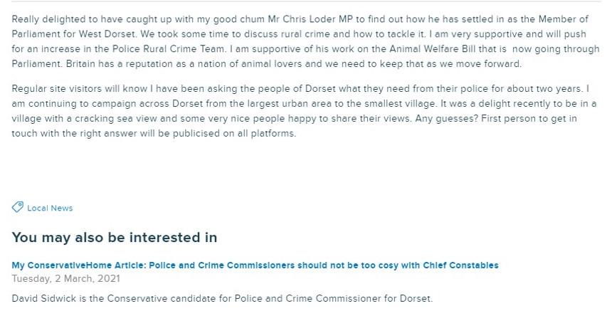 I asked for this information because David Sidwick had previously described Chris Loder MP as his ‘good chum’ in February 2020: