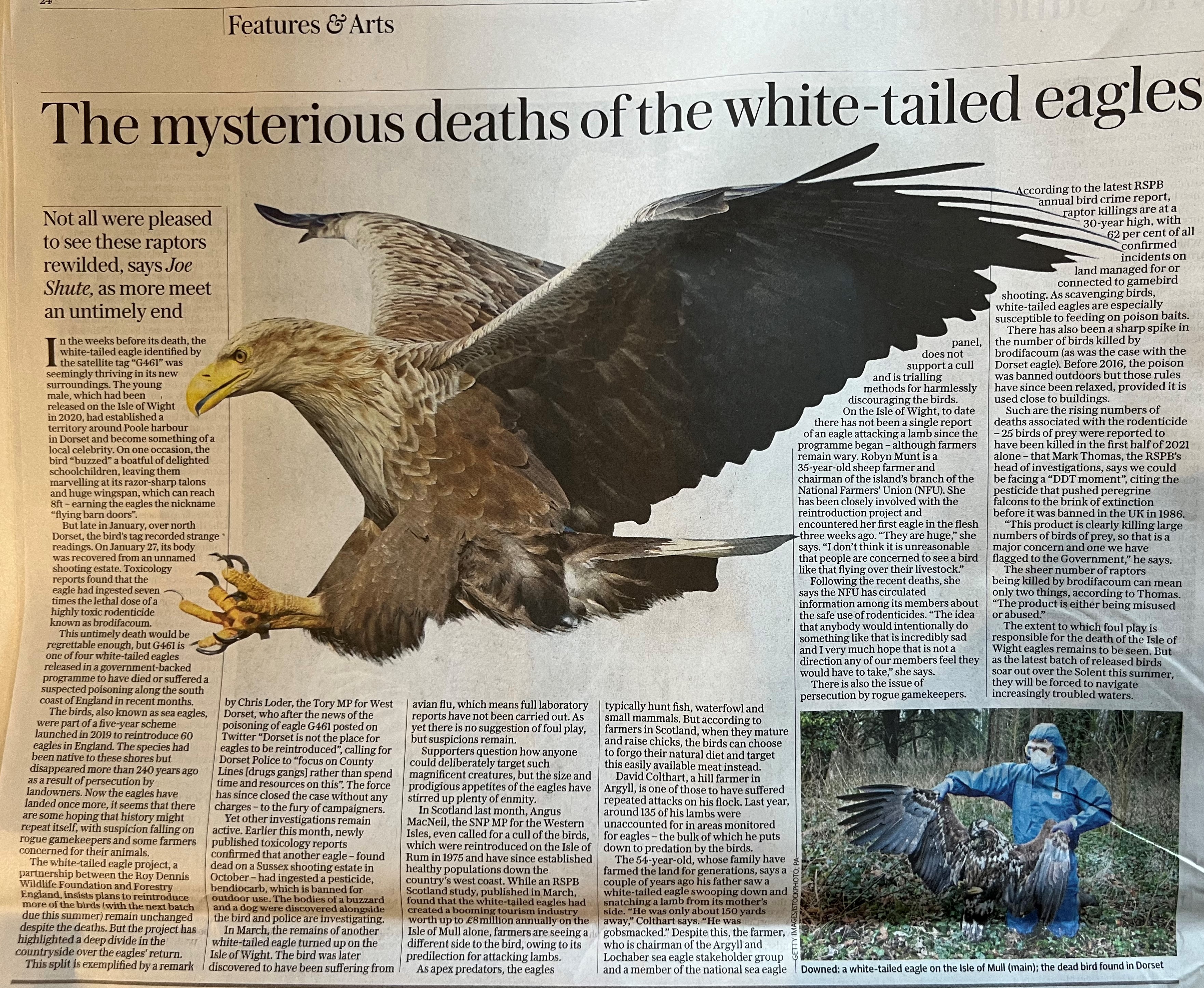 The Telegraph included a feature article on Saturday and, considering the paper’s typical demographic, it was pretty good, even though the deaths of these eagles on game-shooting estates in Dorset and Sussex is anything but ‘mysterious’. The article was well-researched although it didn’t provide us with any new information about either incident.