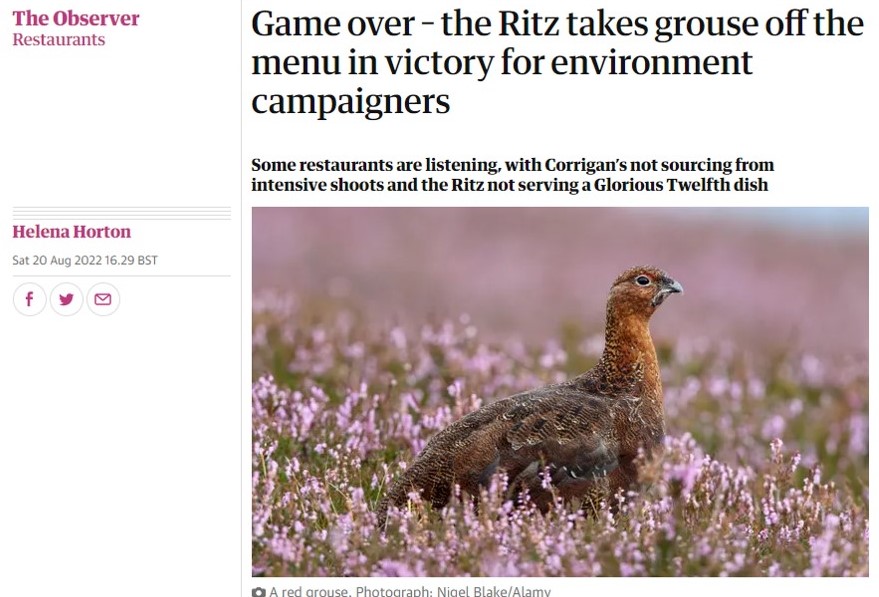 An article in The Observer yesterday made a bold claim that red grouse had been removed from the menu at The Ritz, and this was heralded as a ‘victory for environment campaigners’.